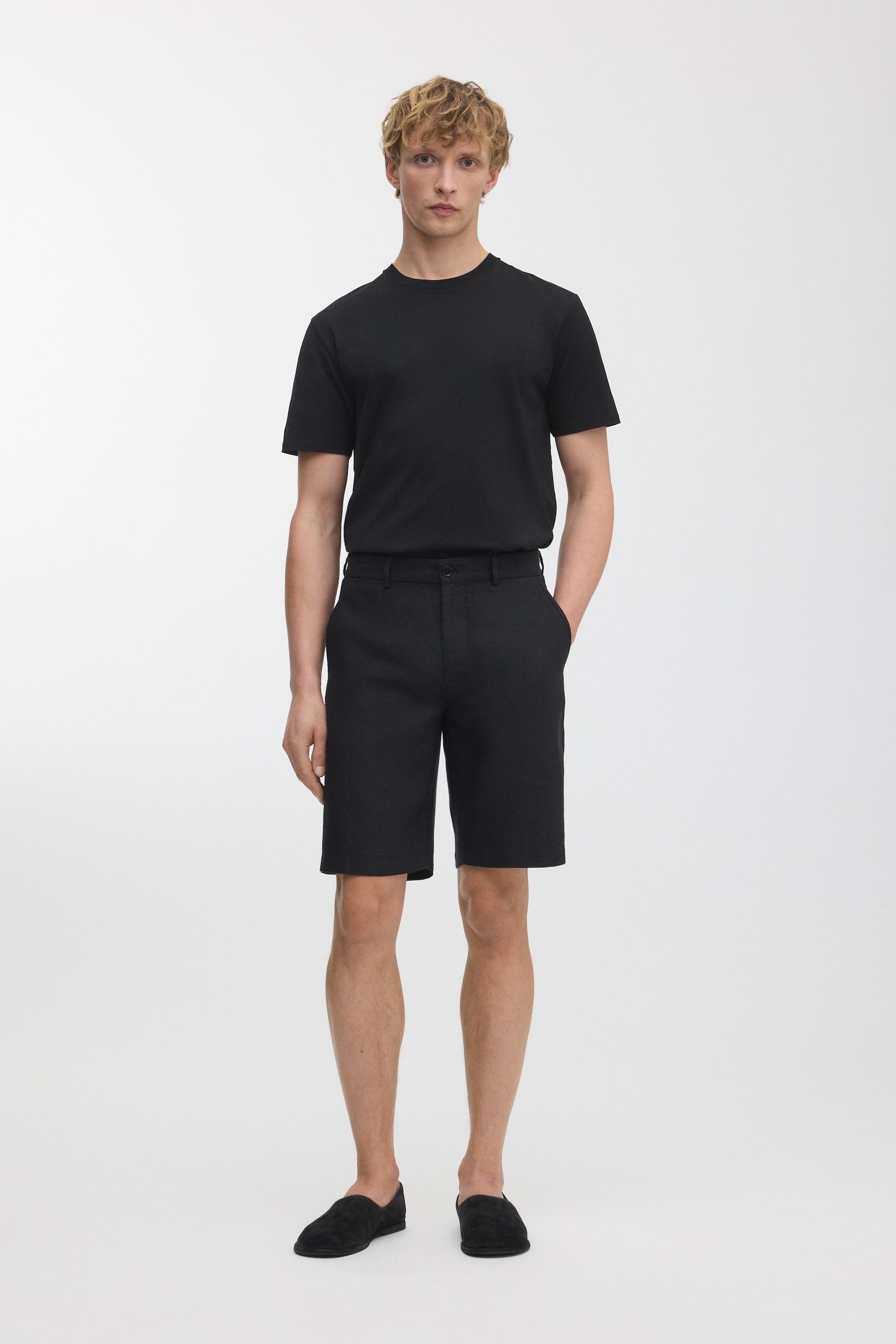 100% long staple French flax. Breezy, midweight 210gsm plain weave fabric. Cut and sewn in Portugal.