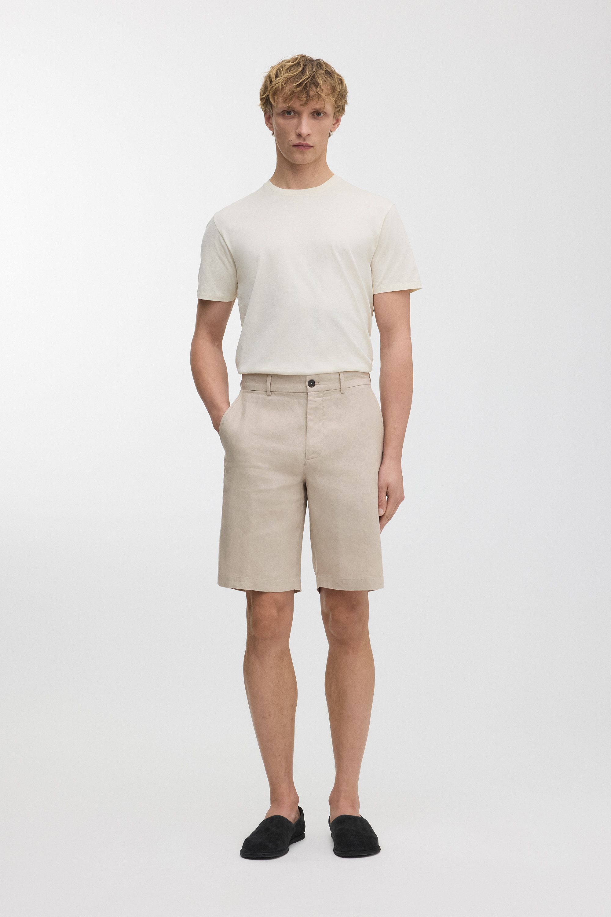 100% long staple French flax. Breezy, midweight 210gsm plain weave fabric. Cut and sewn in Portugal.